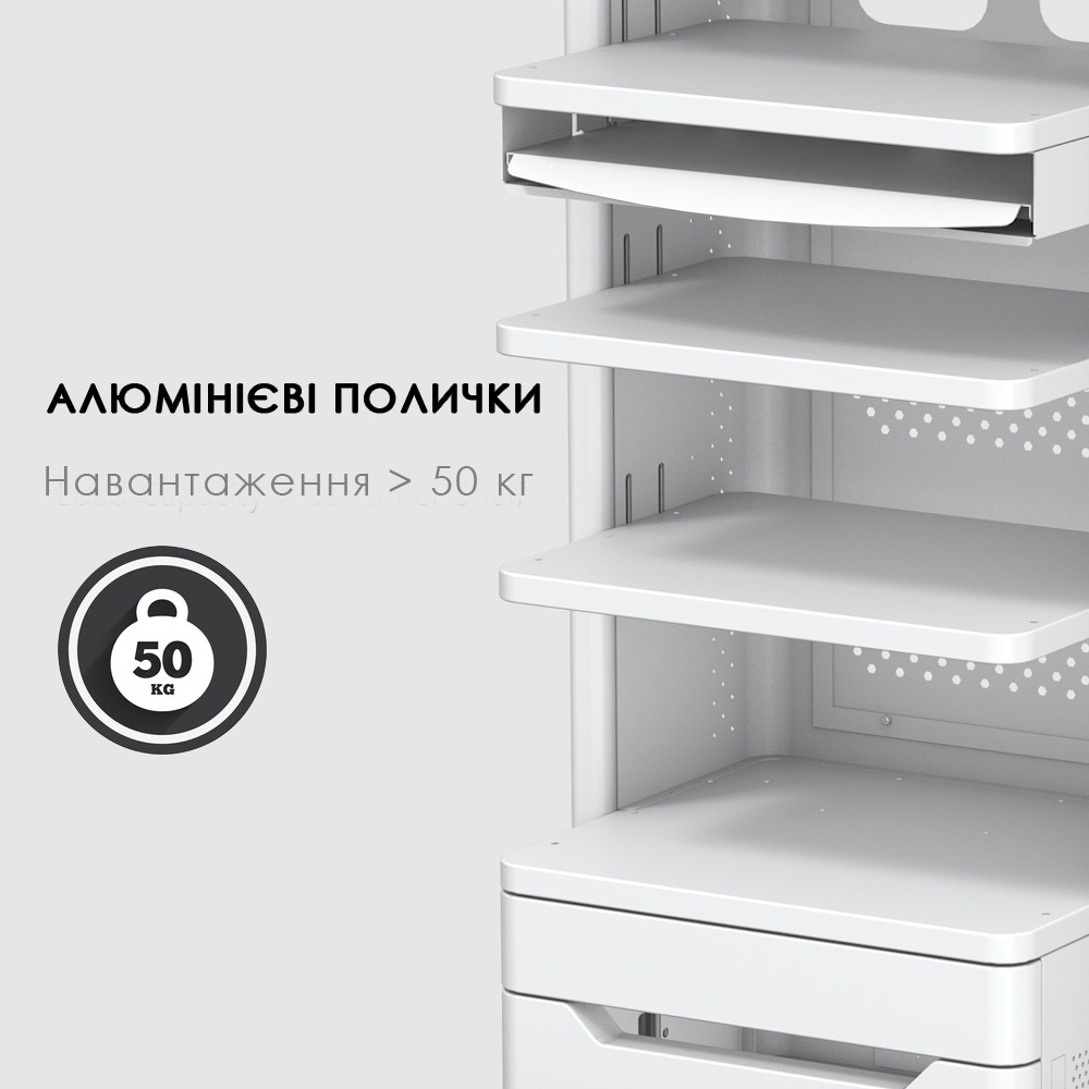 | Опис | Висота - 1284 мм / ширина - 595 мм / глибина - 488 мм / кріплення VESA для моніторів до 32" / антистатичне покриття / блокування 2 колес |